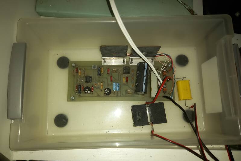 De eindtransistoren zijn gemonteerd op een koelplaatjes, de transistoren zijn met korte draadjes verbonden met de printplaat.